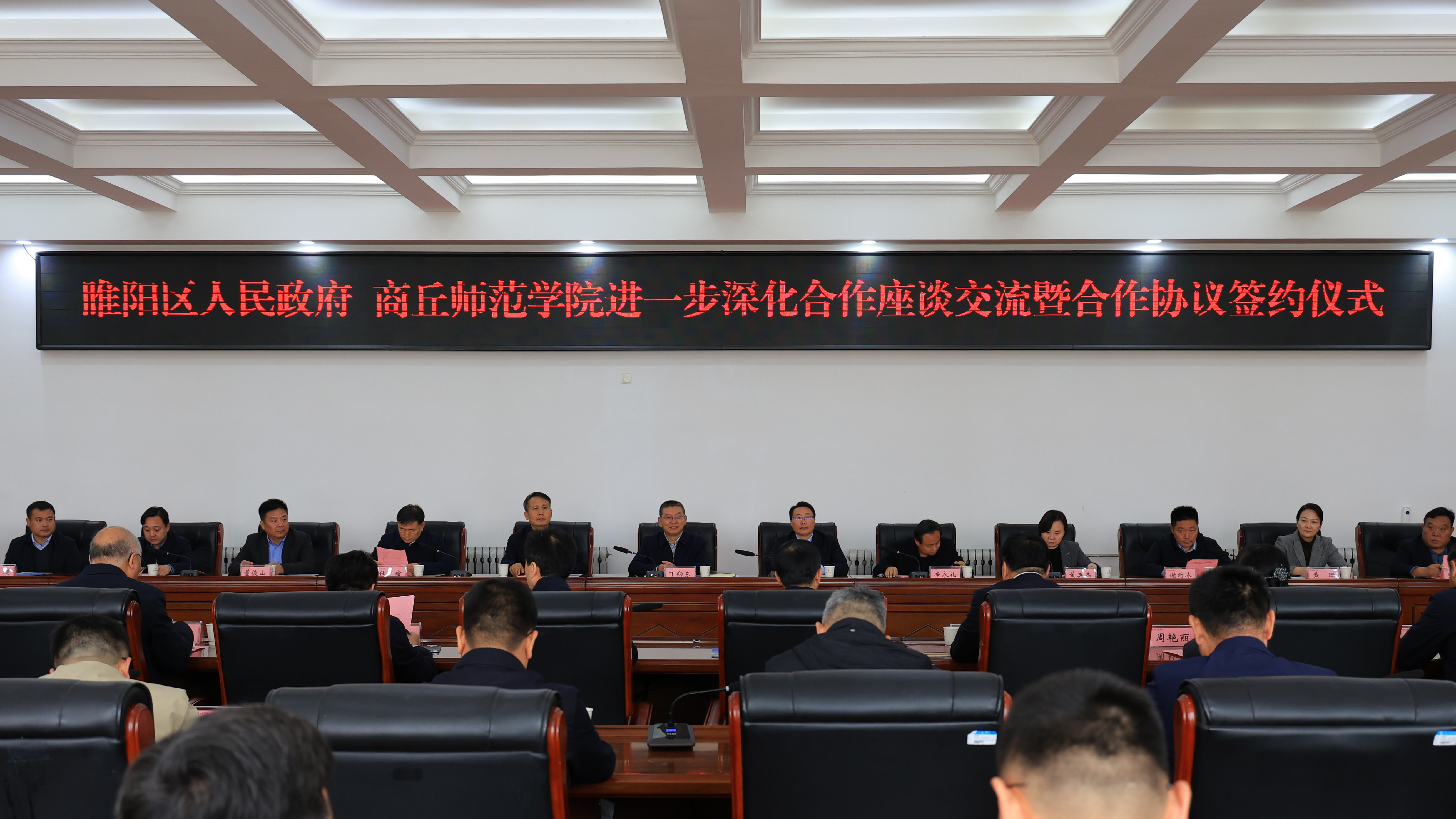 10月22日,我校与睢阳区人民政府举行进一步深化合作座谈交流暨合作协议签约仪式。我校党委书记张尚字、校长陈向炜、校党委副书记吴金山、副校长翟滨,商丘市睢阳区区委书记丁向东、区长李长东出席会议。我校有关职能部门,睢阳区委、区人民政府,睢阳区区直单位负责同志参加签约活动。吴金山主持会议。